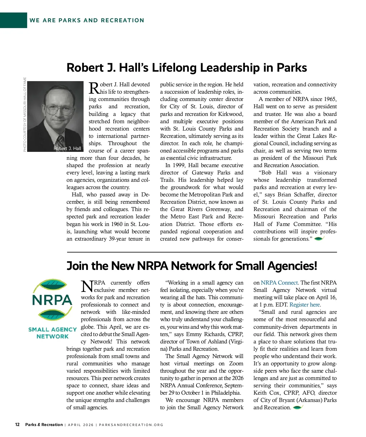 WE ARE PARKS AND RECREATION Robert J. Hall’s Lifelong Leadership in Parks PHOTO COURTESY OF MISSOURI HALL OF FAME obert J. Hall devoted his life to strengthen-ing communities through parks and recreation, building a legacy that stretched from neighbor-hood recreation centers to international partner-ships. Throughout the Robert J. Hall course of a career span-ning more than four decades, he shaped the profession at nearly every level, leaving a lasting mark on agencies, organizations and col-leagues across the country. Hall, who passed away in De-cember, is still being remembered by friends and colleagues. This re-spected park and recreation leader began his work in 1960 in St. Lou-is, launching what would become an extraordinary 39-year tenure in R public service in the region. He held a succession of leadership roles, in-cluding community center director for City of St. Louis, director of parks and recreation for Kirkwood, and multiple executive positions with St. Louis County Parks and Recreation, ultimately serving as its director. In each role, he champi-oned accessible programs and parks as essential civic infrastructure. In 1999, Hall became executive director of Gateway Parks and Trails. His leadership helped lay the groundwork for what would become the Metropolitan Park and Recreation District, now known as the Great Rivers Greenway, and the Metro East Park and Recre-ation District. Those efforts ex-panded regional cooperation and created new pathways for conser-vation, recreation and connectivity across communities. A member of NRPA since 1965, Hall went on to serve as president and trustee. He was also a board member of the American Park and Recreation Society branch and a leader within the Great Lakes Re-gional Council, including serving as chair, as well as serving two terms as president of the Missouri Park and Recreation Association. “Bob Hall was a visionary whose leadership transformed parks and recreation at every lev-el,” says Brian Schaffer, director of St. Louis County Parks and Recreation and chairman of the Missouri Recreation and Parks Hall of Fame Committee. “His contributions will inspire profes-sionals for generations.” Join the New NRPA Network for Small Agencies! RPA currently offers exclusive member net-works for park and recreation professionals to connect and network with like-minded professionals from across the globe. This April, we are ex-cited to debut the Small Agen-cy Network! This network brings together park and recreation professionals from small towns and rural communities who manage varied responsibilities with limited resources. This peer network creates space to connect, share ideas and support one another while elevating the unique strengths and challenges of small agencies. 12 Parks & Recreation N “Working in a small agency can feel isolating, especially when you’re wearing all the hats. This communi-ty is about connection, encourage-ment, and knowing there are others who truly understand your challeng-es, your wins and why this work mat-ters,” says Emmy Richards, CPRP, director of Town of Ashland (Virgi-na) Parks and Recreation. The Small Agency Network will host virtual meetings on Zoom throughout the year and the oppor-tunity to gather in person at the 2026 NRPA Annual Conference, Septem-ber 29 to October 1 in Philadelphia. We encourage NRPA members to join the Small Agency Network on NRPA Connect. The first NRPA Small Agency Network virtual meeting will take place on April 16, at 1 p.m. EDT. Register here. “Small and rural agencies are some of the most resourceful and community-driven departments in our field. This network gives them a place to share solutions that tru-ly fit their realities and learn from people who understand their work. It’s an opportunity to grow along-side peers who face the same chal-lenges and are just as committed to serving their communities,” says Keith Cox, CPRP, AFO, director of City of Bryant (Arkansas) Parks and Recreation. | APRIL 2026 | PARKSANDRECREATION.ORG