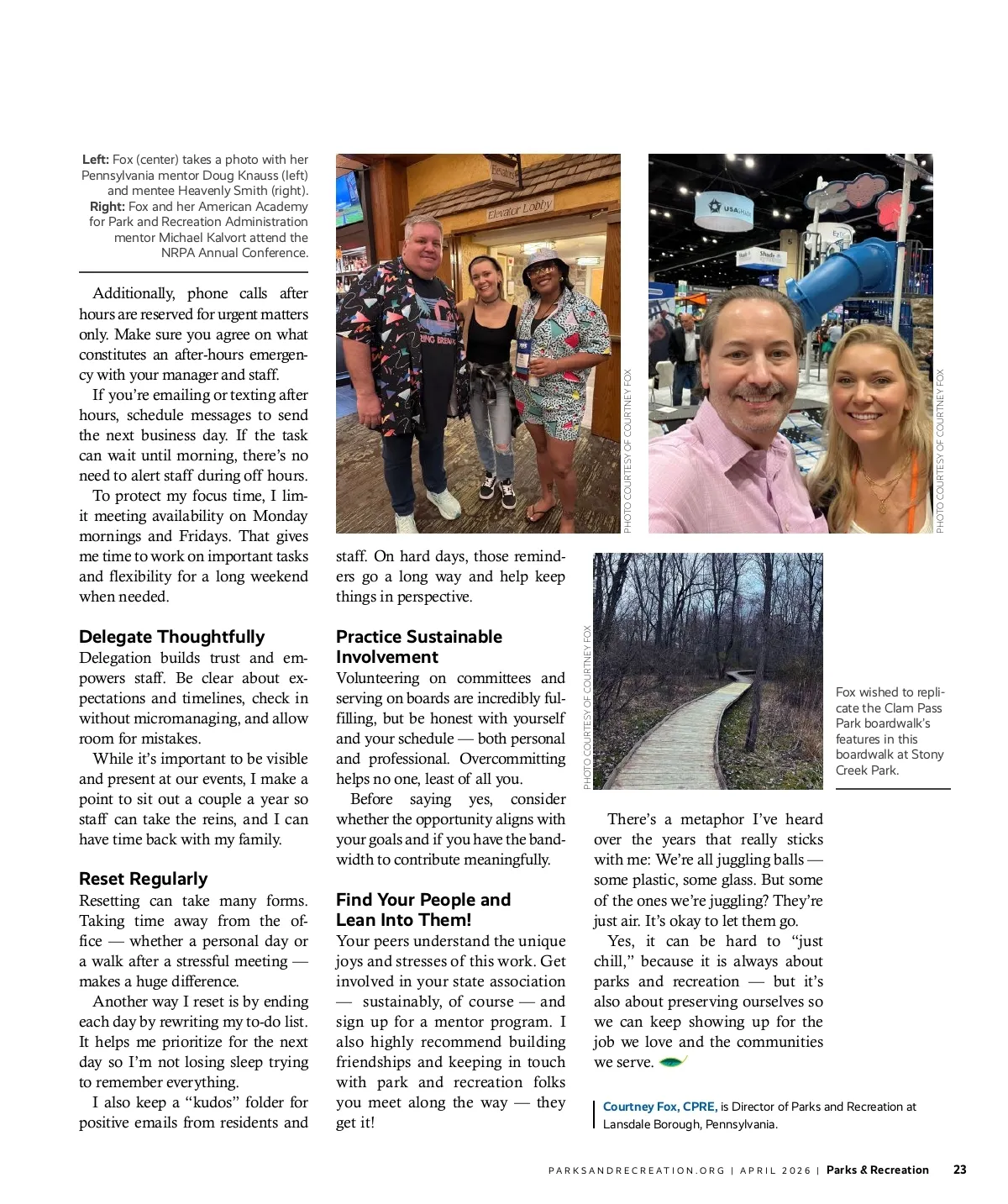 HEALTH AND WELL-BEING While walking along a boardwalk in Florida’s Clam Pass Park during a family vacation, Courtney Fox found her mind wandering back to Stony Creek Park in Landsdale, Pennsylvania, where she serves as the director of parks and recreation. PHOTO COURTESY OF COURTNEY FOX Creating Work-Life Balance When Parks and Recreation Is Life By Courtney Fox, CPRE I n spring 2024, my family and I vacationed in Naples, Florida. We were excited to spend a relaxing day at Clam Pass Park and start-ed down the three-quarter-mile boardwalk. It was beautiful — wide, clean and well-maintained. My first thought was: “I wish I could build a boardwalk like this in Stony Creek Park!” Suddenly, I was no longer on vacation; I was back in Lansdale, Pennsylvania, thinking about our narrow, high-maintenance wooden boardwalk and brainstorming po-tential grant opportunities. I talked about work for the re-mainder of the walk until my husband finally said, “Court, just chill. It’s not always about parks and rec.” But in my head, I thought, “Ac-tually, it kind of is!” When you love what you do, it’s hard to turn that part of your brain off. Our field isn’t exactly a “clock in, clock out” profession. We’re juggling capital projects, grants, staff issues, community events, public expectations — and so much more! No wonder it can be tough to leave work at work. Additionally, much of what we do in our free time mirrors our work. Evenings and weekends are spent participating in programs, attending events, visiting play-grounds or watching youth sports — it’s no wonder it feels like we are always “on.” That overlap can help us serve our communities better, but it also can lead to burnout and blurred boundaries. Fortunately, there are simple, in-tentional steps we can take to bring our work life into balance. Set Boundaries and Communication Protocols Create clear boundaries around emails, calls and availability. Not reading emails after hours is a hab-it I am still working on, but one thing I never do is respond after hours. If you respond to emails after hours, people will assume you’re available after hours. 22 Parks & Recreation | APRIL 2026 | PARKSANDRECREATION.ORG