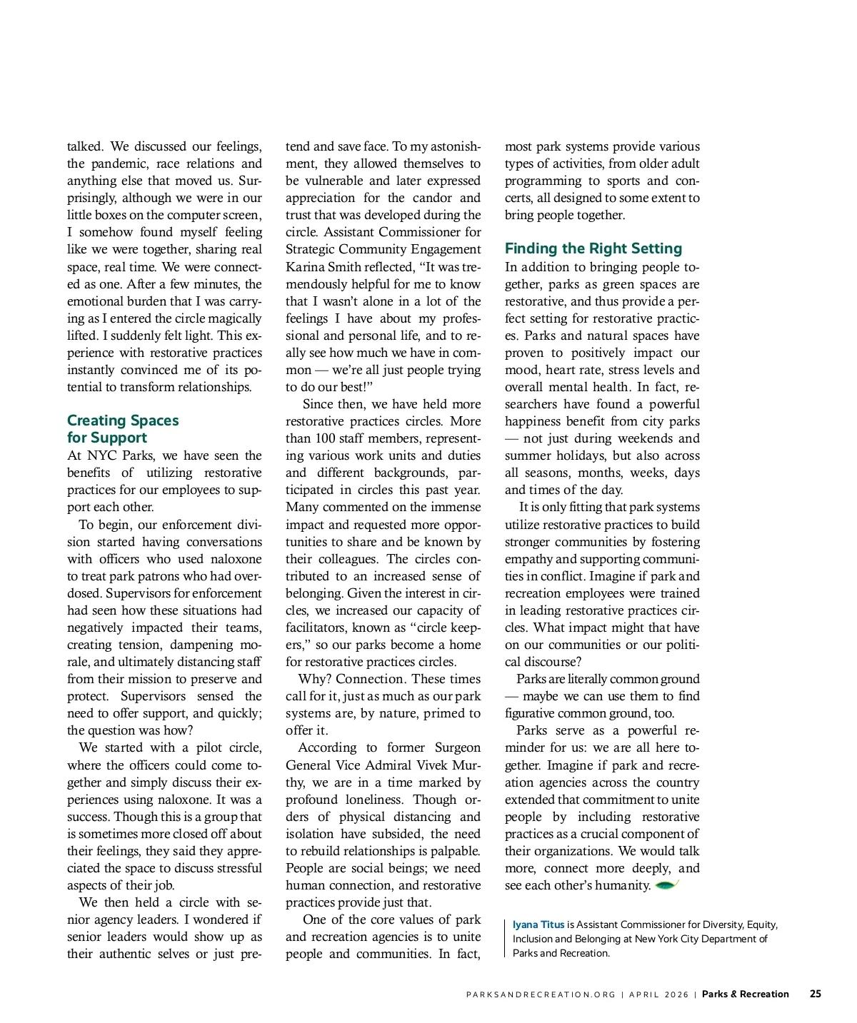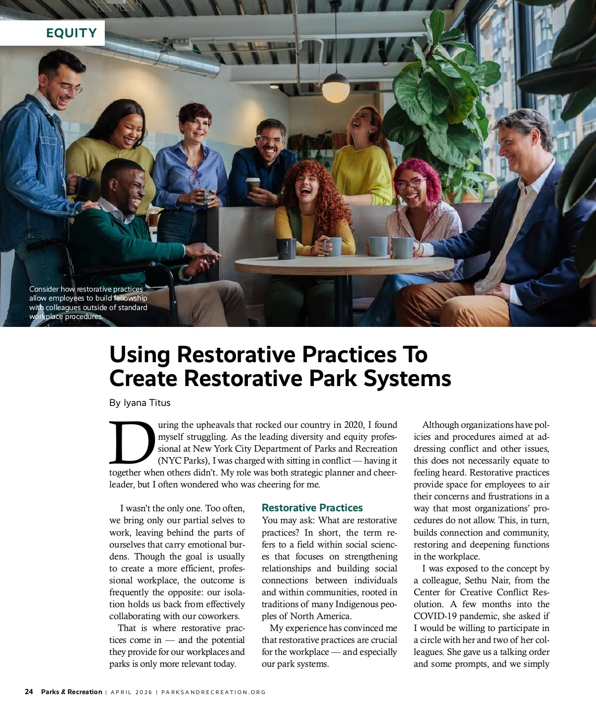 EQUITY Consider how restorative practices allow employees to build fellowship with colleagues outside of standard workplace procedures. Using Restorative Practices To Create Restorative Park Systems D By Iyana Titus uring the upheavals that rocked our country in 2020, I found myself struggling. As the leading diversity and equity profes-sional at New York City Department of Parks and Recreation (NYC Parks), I was charged with sitting in conflict — having it together when others didn’t. My role was both strategic planner and cheer-leader, but I often wondered who was cheering for me. I wasn’t the only one. Too often, we bring only our partial selves to work, leaving behind the parts of ourselves that carry emotional bur-dens. Though the goal is usually to create a more efficient, profes-sional workplace, the outcome is frequently the opposite: our isola-tion holds us back from effectively collaborating with our coworkers. That is where restorative prac-tices come in — and the potential they provide for our workplaces and parks is only more relevant today. Although organizations have pol-icies and procedures aimed at ad-dressing conflict and other issues, this does not necessarily equate to feeling heard. Restorative practices provide space for employees to air their concerns and frustrations in a way that most organizations’ pro-cedures do not allow. This, in turn, builds connection and community, restoring and deepening functions in the workplace. I was exposed to the concept by a colleague, Sethu Nair, from the Center for Creative Conflict Res-olution. A few months into the COVID-19 pandemic, she asked if I would be willing to participate in a circle with her and two of her col-leagues. She gave us a talking order and some prompts, and we simply Restorative Practices You may ask: What are restorative practices? In short, the term re-fers to a field within social scienc-es that focuses on strengthening relationships and building social connections between individuals and within communities, rooted in traditions of many Indigenous peo-ples of North America. My experience has convinced me that restorative practices are crucial for the workplace — and especially our park systems. 24 Parks & Recreation | APRIL 2026 | PARKSANDRECREATION.ORG