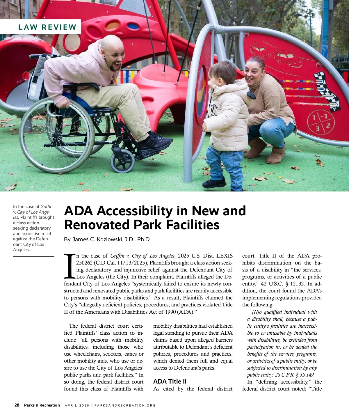LAW REVIEW In the case of Griffin v. City of Los Ange-les , Plaintiffs brought a class action seeking declaratory and injunctive relief against the Defen-dant City of Los Angeles. ADA Accessibility in New and Renovated Park Facilities By James C. Kozlowski, J.D., Ph.D. I n the case of Griffin v. City of Los Angeles , 2025 U.S. Dist. LEXIS 250262 (C.D Cal. 11/13/2025), Plaintiffs brought a class action seek-ing declaratory and injunctive relief against the Defendant City of Los Angeles (the City). In their complaint, Plaintiffs alleged the De-fendant City of Los Angeles “systemically failed to ensure its newly con-structed and renovated public parks and park facilities are readily accessible to persons with mobility disabilities.” As a result, Plaintiffs claimed the City’s “allegedly deficient policies, procedures, and practices violated Title II of the Americans with Disabilities Act of 1990 (ADA).” The federal district court certi-fied Plaintiffs’ class action to in-clude “all persons with mobility disabilities, including those who use wheelchairs, scooters, canes or other mobility aids, who use or de-sire to use the City of Los Angeles’ public parks and park facilities.” In so doing, the federal district court found this class of Plaintiffs with mobility disabilities had established legal standing to pursue their ADA claims based upon alleged barriers attributable to Defendant’s deficient policies, procedures and practices, which denied them full and equal access to Defendant’s parks. ADA Title II As cited by the federal district court, Title II of the ADA pro-hibits discrimination on the ba-sis of a disability in “the services, programs, or activities of a public entity.” 42 U.S.C. § 12132. In ad-dition, the court found the ADA’s implementing regulations provided the following: [N]o qualified individual with a disability shall, because a pub-lic entity’s facilities are inaccessi-ble to or unusable by individuals with disabilities, be excluded from participation in, or be denied the benefits of the services, programs, or activities of a public entity, or be subjected to discrimination by any public entity. 28 C.F.R. § 35.149. In “defining accessibility,” the federal district court noted: “Title 28 Parks & Recreation | APRIL 2026 | PARKSANDRECREATION.ORG