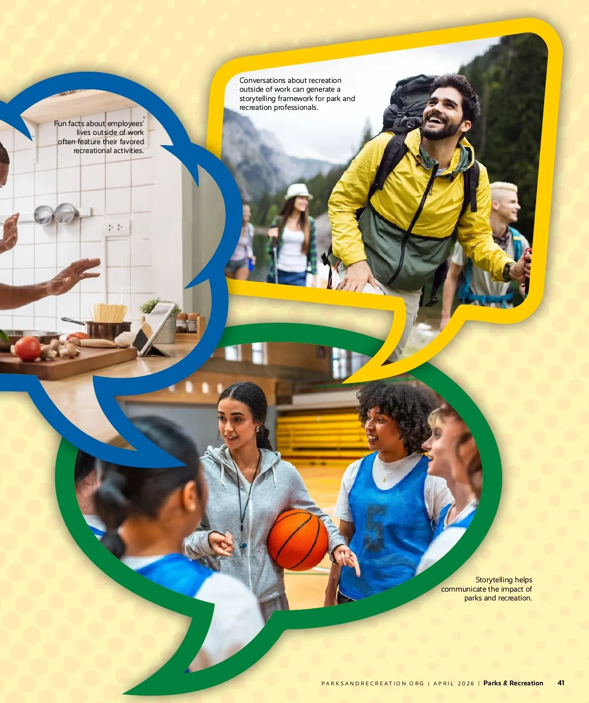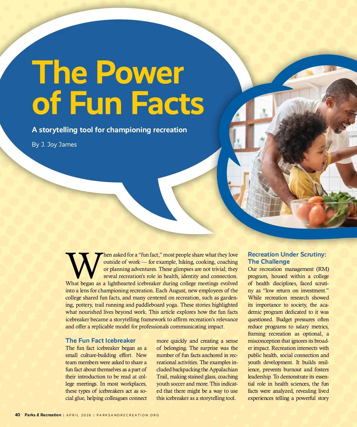 The Power of Fun Facts A storytelling tool for championing recreation By J. Joy James W hen asked for a “fun fact,” most people share what they love outside of work — for example, hiking, cooking, coaching or planning adventures. These glimpses are not trivial; they reveal recreation’s role in health, identity and connection. What began as a lighthearted icebreaker during college meetings evolved into a lens for championing recreation. Each August, new employees of the college shared fun facts, and many centered on recreation, such as garden-ing, pottery, trail running and paddleboard yoga. These stories highlighted what nourished lives beyond work. This article explores how the fun facts icebreaker became a storytelling framework to affirm recreation’s relevance and offer a replicable model for professionals communicating impact. Recreation Under Scrutiny: The Challenge Our recreation management (RM) program, housed within a college of health disciplines, faced scruti-ny as “low return on investment.” While recreation research showed its importance to society, the aca-demic program dedicated to it was questioned. Budget pressures often reduce programs to salary metrics, framing recreation as optional, a misconception that ignores its broad-er impact. Recreation intersects with public health, social connection and youth development. It builds resil-ience, prevents burnout and fosters leadership. To demonstrate its essen-tial role in health sciences, the fun facts were analyzed, revealing lived experiences telling a powerful story The Fun Fact Icebreaker The fun fact icebreaker began as a small culture -building effort. New team members were asked to share a fun fact about themselves as a part of their introduction to be read at col-lege meetings. In most workplaces, these types of icebreakers act as so-cial glue, helping colleagues connect 40 Parks & Recreation more quickly and creating a sense of belonging. The surprise was the number of fun facts anchored in rec-reational activities. The examples in-cluded backpacking the Appalachian Trail, making stained glass, coaching youth soccer and more. This indicat-ed that there might be a way to use this icebreaker as a storytelling tool. | APRIL 2026 | PARKSANDRECREATION.ORG